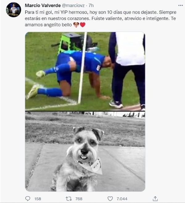 Lo peculiar fue la celebración de Marcio Valverde, quien corrió a la zona del córner y fingió ser un perro para luego imitar la forma que orina el canino, después de esto miro al cielo dedicando el gol. “Para ti mi gol, mi YIP hermoso hoy son 10 días que nos dejaste. Siempre estarás en nuestros corazones. Fuiste valiente, atrevido e inteligente. Te amamos angelito bello”, publicó en su cuenta de Twitter el futbolista.