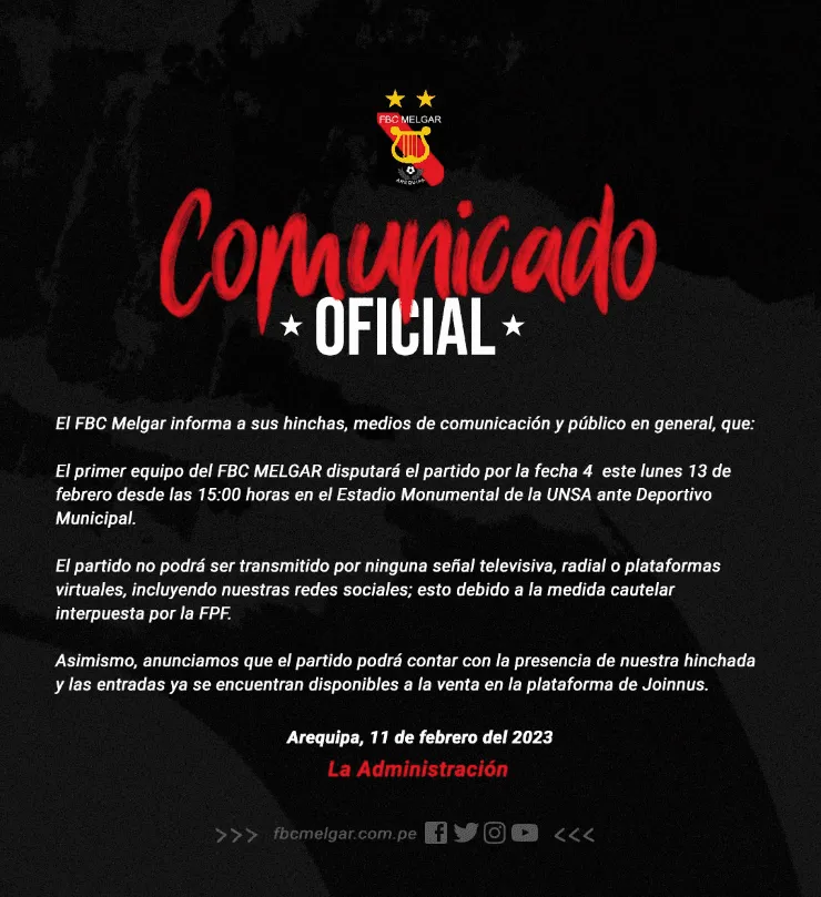 Melgar FBC, junto a Alianza Lima, Deportivo Municipal, Binacional, Cienciano y Cusco FC, no se presentaron en la Fecha 3 del Torneo Apertura de la Liga 1, debido a que no están de acuerdo con la Federación Peruana de Fútbol, sobre el proyecto de los derechos de transmisión.