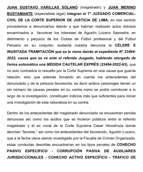 La parte final es dura, pero sincera: “Existiendo un claro y evidente vicio en la tramitación de la medida cautelar, así como la instrumentalización del poder judicial para que, mediante operadores que lindan con hechos de corrupción como Juan Gustavo Varillas Solano (Magistrado) Y Juan Merino Bustamante (Especialista Legal), accedan a sus requerimientos. Es decir, se pide una resolución que previamente ya estaría acordada por debajo de la mesa perjudicando aún más a los clubes”. ¿Cómo acabará esto? Da para largo, al parecer.