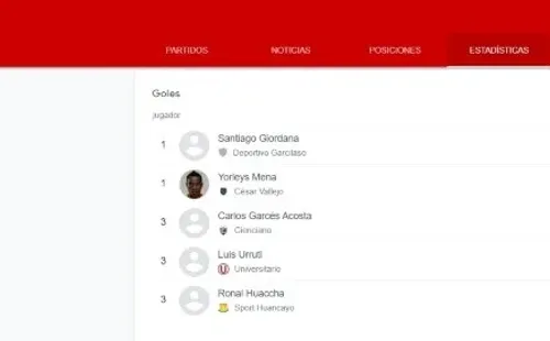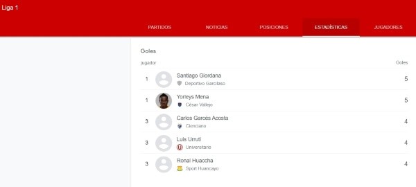 Así pues, tanto Santiago Giordana de Deportivo Garcilaso como Yorleys Mena de la Universidad César Vallejo tienen 5 goles en sus registros del Torneo Apertura de la Liga 1. Lo siguen Carlos Acosta de Cienciano, Luis Urruti de Universitario y Ronal Huaccha de Sport Huancayo, ambos con 4 tantos.