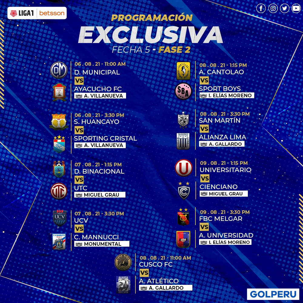 El último encuentro de la quinta fecha se jugará entre FBC Melgar contra Alianza Universidad, a las 3:30 pm en el Estadio Iván Elías Moreno de Villa El Salvador, si alguno de los dos equipos logra la victoria se podría ubicar en lo más alto de la tabla junto al conjunto ‘blanquiazul’ con 11 puntos sumados en la Fase 2 de la Liga 1.