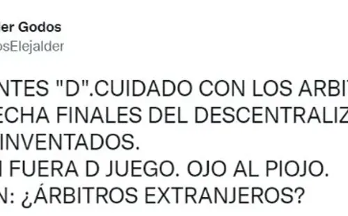 “Lo dije antes de: Cuidado con los arbitrajes en las fechas finales del descentralizado. Penales inventados, goles en fuera de juego. Ojo al piojo. Solución: ¿árbitros extranjeros?“, publicó en su cuenta de Twitter Elejalder Godos.