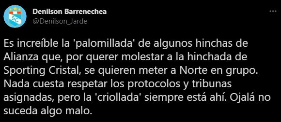 Denilson Barrenechea, un comunicador hincha ‘bajopontino’ mencionó en Twitter lo siguiente: “Es increíble la ‘palomillada’ de algunos hinchas de Alianza que, por querer molestar a la hinchada de Sporting Cristal, se quieren meter a Norte en grupo. Nada cuesta respetar los protocolos y tribunas asignadas, pero la ‘criollada’ siempre está ahí. Ojalá no suceda algo malo”.