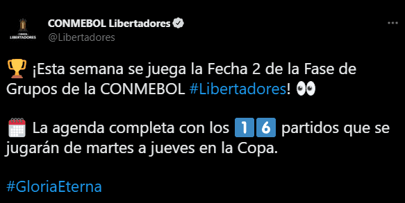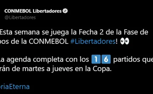 Mediante las redes sociales del organizador de este evento sudamericano, se pudo ver el siguiente mensaje en Twitter: “¡Esta semana se juega la Fecha 2 de la Fase de Grupos de la CONMEBOL Libertadores!”. Para después pasar a notar cuáles serán los medios de difusión para ‘íntimos’ y ‘celestes’.