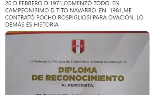 “Gracias a mi Dios y al titular de la FPF, Agustín Lozano por el reconocimiento a mis 50 años de carrera como periodista deportivo”, escribió Elejalder Godos.