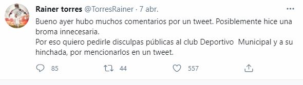 El comentario recibió cientos de respuestas de hinchas de Alianza Lima, y un día después, Rainer pidió disculpas: “Posiblemente hice una broma innecesaria. Por eso quiero pedirle disculpas públicas al club Deportivo Municipal y a su hinchada”.