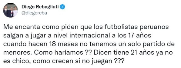 “Me encanta como piden que los futbolistas peruanos salgan a jugar a nivel internacional a los 17 años, cuando hacen 18 meses no tenemos un solo partido de menores. ¿Cómo haríamos? Dicen: ‘tiene 21 años ya no es chico’, ¿cómo crecen si no juegan?”, cuestionó el periodista deportivo Diego Rebagliati en su cuenta oficial de Twitter.