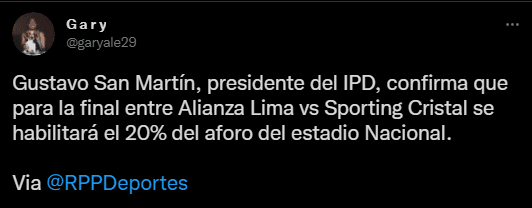 Alianza Lima y Sporting Cristal serán los encargados de disputar los encuentros que dejarán a uno solo como campeón nacional. En el Estadio Nacional habrá un aforo confirmado hasta el momento de 20%. Así lo hizo saber el presidente del IPD, Gustavo San Martín, en RPP Noticias.