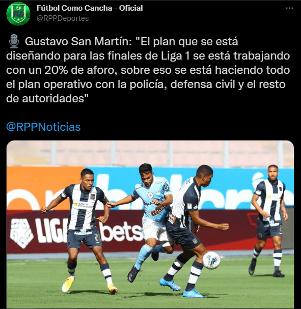 “El plan que se está diseñando para las finales de Liga 1 se está trabajando con un 20% de aforo, sobre eso se está haciendo todo el plan operativo con la policía, defensa civil y el resto de autoridades”. Fue lo que señaló exactamente el encargado del ‘Instituto Peruano del Deporte’.