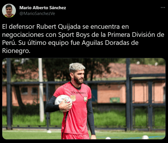Quien acerca esta información es el periodista ‘llanero’, Mario Alberto Sánchez, de ‘El Mundo es un Balón’: “El defensor Rubert Quijada se encuentra en negociaciones con Sport Boys de la Primera División de Perú. Su último equipo fue Águilas Doradas de Rionegro”.