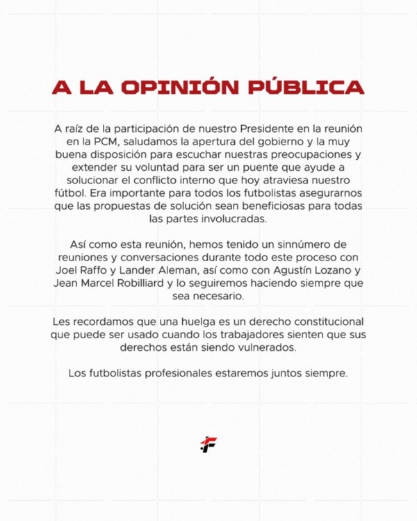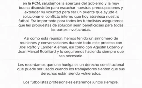 En esa línea, la SAFAP también recordó que la huelga es un “derecho constitucional”, dando así respuesta a un anterior comunicado por parte de los clubes que están del lado de la FPF al mencionar que “no deberían haber terceros propiciando la huelga”.