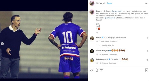 “Gracias Pablo Peirano por haber confiado en mi para esta temporada. A todo el CT, compañeros y staff, gracias por hacer de este año el mejor de mi carrera. Le deseo a @camannucci (Carlos A. Mannucci) y toda su gente muchos éxitos para el futuro!!“, fue lo que publicó el futbolista en Instagram.