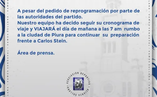 Luego, vía redes sociales, trascendió que Alianza Atlético no jugará el cotejo de mañana a las 11:00 AM ante Alianza Lima. Informando que continuarán con su cronograma, el comunicado es claro al precisar que viajará mañana a las 7:00 AM.
