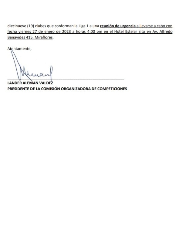 Al final, destacan que todos juntos realizarán los esfuerzos para lograr el entendimiento de los clubes y que garantice el normal desarrollo del torneo. Firma, Lander Aleman, presidente de la Comisión Organizadora de Competiciones y de Alianza Atlético, quien convoca a una reunión urgente a los clubes para el viernes 27 a las 4:00 pm.