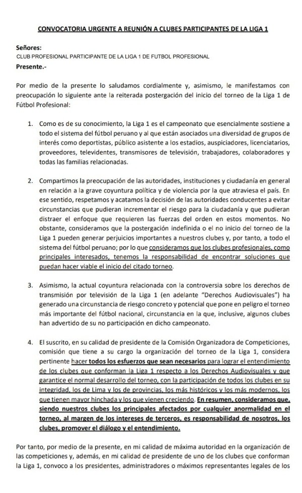 Dentro del papel oficial que notifica esta entidad, que pertenece a la Liga 1, destaca una preocupación por parte de las autoridades, instituciones y ciudadanía en general, con la grave coyuntura política y de violencia por la que atraviesa el país y que respetan y acatan las decisiones de las autoridades.