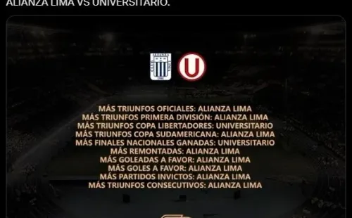 En su cuenta de Twitter, Son Datos No Opiniones (Jesús Chirinos), propuso un detallado interesante: “DATOS DEL CLÁSICO DEL FÚTBOL PERUANO EN COTEJOS OFICIALES: ALIANZA LIMA VS UNIVERSITARIO”. El cual podemos ver ahora mismo, transcribiendo lo bueno, malo, y feo, dependiendo hincha de que cuadro eres.