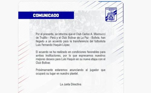 “Por el presente, se informa que Carlos Mannucci y Bolivar, han llegado a un acuerdo para la transferencia del futbolista Luis Haquín. Expresamos nuestros mejores deseos para el futbolista en esta nueva etapa”, fue el mensaje que publicó el club trujillano junto al comunicado que expresa la salida del boliviano.