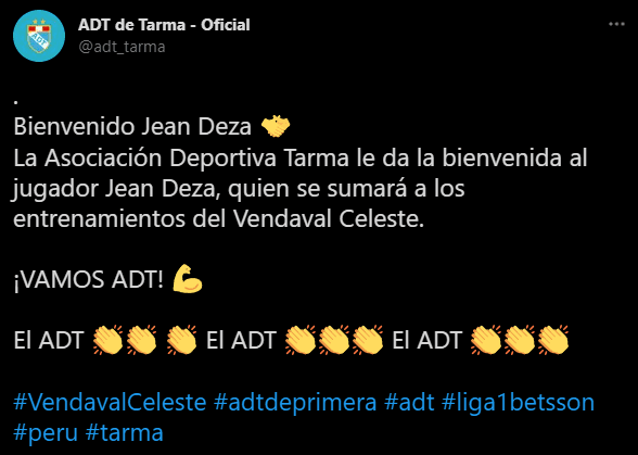 “Bienvenido Jean Deza. La Asociación Deportiva Tarma le da la bienvenida al jugador Jean Deza, quien se sumará a los entrenamientos del Vendaval Celeste. ¡VAMOS ADT!”. Fue lo que comunicó en sus redes sociales el conjunto conocido popularmente como ‘El Vendaval Celeste’.
