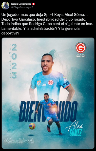 Lo resume bien el periodista del Diario Líbero, Diego Sotomayor, quien publicó en su cuenta de Twitter, la información con algo de opinión: “Un jugador más que deja Sport Boys. Alexi Gómez a Deportivo Garcilaso. Inestabilidad del club rosado. Todo indica que Rodrigo Cuba será el siguiente en irse. Lamentable. ¿Y la administración? ¿Y la gerencia deportiva?”.