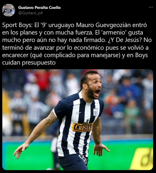 “Sport Boys: El ‘9’ uruguayo Mauro Guevgeozián entró en los planes y con mucha fuerza. El ‘armenio’ gusta mucho pero aún no hay nada firmado. ¿Y De Jesús? No terminó de avanzar por lo económico pues se volvió a encarecer (qué complicado para manejarse) y en Boys cuidan presupuesto”. Veremos si este goleador, termina fichando el contrato.