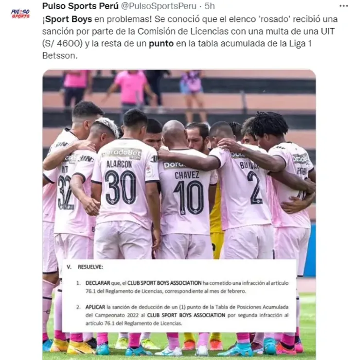 La Comisión de Licencias dela Federación Peruana de Fútbol resolvió aplicar la reducción de un punto a Sport Boys en la tabla acumulada de la Liga1 Betsson 2022. Esto en concordancia con la resolución 033-CCL-FPF-2022, emitida el 8 de abril del 2022. Asimismo, el club ‘rosado’ deberá pagar una multa equivalente al valor deuna UIT (S/ 4.600).