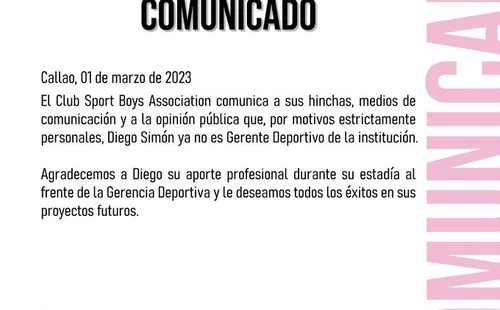 “El Club Sport Boys Association comunica a sus hinchas. Medios de comunicación y a la opinión pública que, por motivos estrictamente personales, Diego Simón ya no es Gerente Deportivo de la institución”, publicaron.