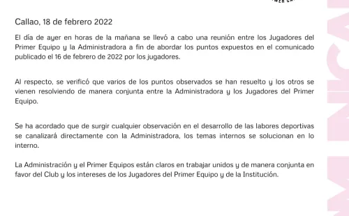 El pasado martes 15 de febrero los jugadores del Sport Boys, mediante un comunicado, dieron a conocer la situación que están viviendo en el club, entre los problemas que aquejan están el incumplimiento en los pagos, la logística, la locación para que entrene el grupo y también la alimentación que se les viene brindando en lo que va del 2022.
