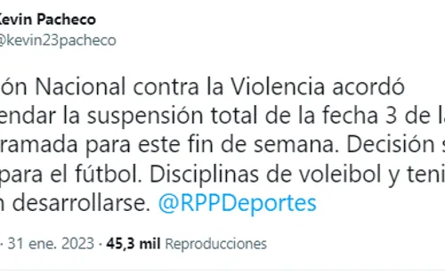 “Comisión Nacional contra la Violencia acordó recomendar la suspensión total de la fecha 3 de la Liga 1 programada para este fin de semana. Esta decisión sólo aplica para el fútbol. Disciplinas de voleibol y tenis podrán desarrollarse” publicó.