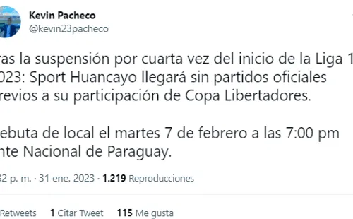 “Tras la suspensión por cuarta vez del inicio de la Liga 1 2023: Sport Huancayo llegará sin partidos oficiales previos a su participación de Copa Libertadores. Debuta de local el martes 7 de febrero a las 7:00 pm ante Nacional de Paraguay”, informó.