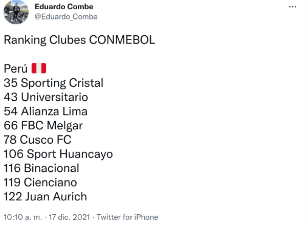 Luego, están los Íntimos en el lugar54. En cuarto lugar peruano está elFBC Melgar (66). Cusco FC (78),Sport Huancayo (106),Binacional (116), Cienciano (119) yJuan Aurich (122) son los que le siguen. Ojalá prontó todos mejoren ¡Sí se puede!