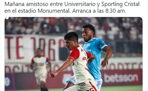 Mañana amistoso entre Universitario y Sporting Cristal en el estadio Monumental. Arranca a las 8:30 am”, escribió el comunicador.