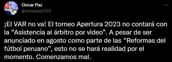 Menciona el panelista del programa que conduce Gonzalo Núñez esto: “¡El VAR no va! El torneo Apertura 2023 no contará con la “Asistencia al árbitro por video”. A pesar de ser anunciado en agosto como parte de las “Reformas del fútbol peruano”, esto no se hará realidad por el momento. Comenzamos mal”.