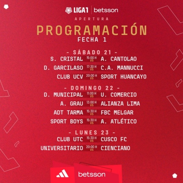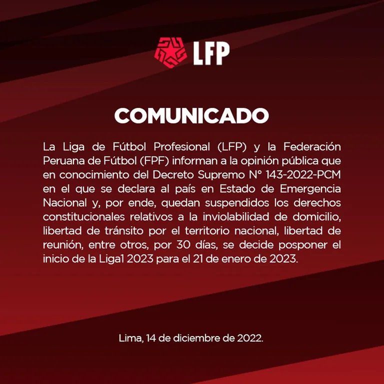 Según la publicación de Liga 1, donde revela que todo está listo, así se debería dar el primer toque de balón: “La Liga de Fútbol Profesional (LFP) y la Federación Peruana de Fútbol (FPF) informan a la opinión pública que en conocimiento del Decreto Supremo N° 143-2022-PCM en el que se declara al país en estado de emergencia nacional, por ende, quedan suspendidos los derechos constitucionales relativos a la inviolabilidad de domicilio, libertad de tránsito por el territorio nacional, libertad de reunión, entre otros, por 30 días, se decide posponer el inicio de la Liga 1 2023 para el 21 de enero de 2023”.