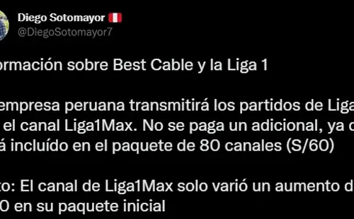 “Información sobre Best Cable y la Liga 1. La empresa peruana transmitirá los partidos de Liga 1 por el canal Liga 1 Max. No se paga un adicional, ya que está incluido en el paquete de 80 canales (S/60). Dato: El canal de Liga 1 Max solo varió un aumento de S/10 en su paquete inicial”, menciona el comunicado social.