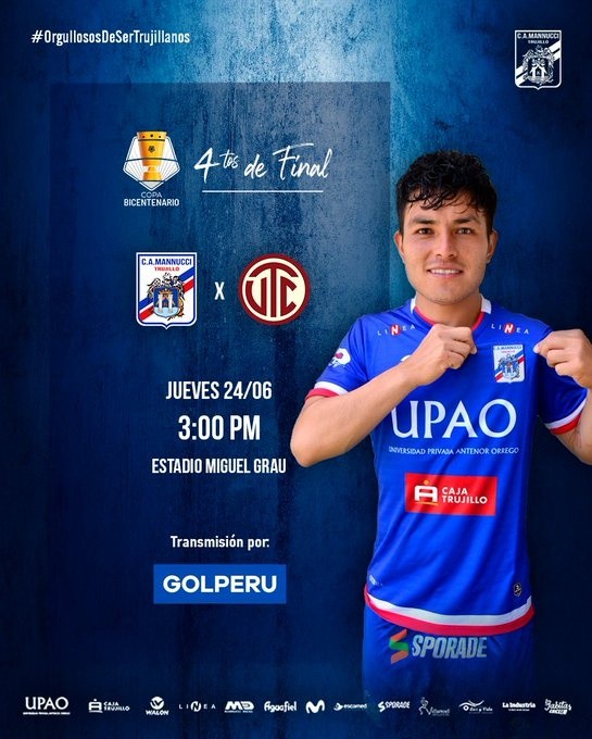 Se juegan los cuartos de final de laCopa Bicentenarioy este jueves24de junio,UTC Cajamarcaen condición de local recibe a su similar deCarlos Mannuccien un cotejo que entregará grandes emociones. El duelo será transmitidoEN VIVO Y EN DIRECTOa través de la pantalla deGOL PERÚ.