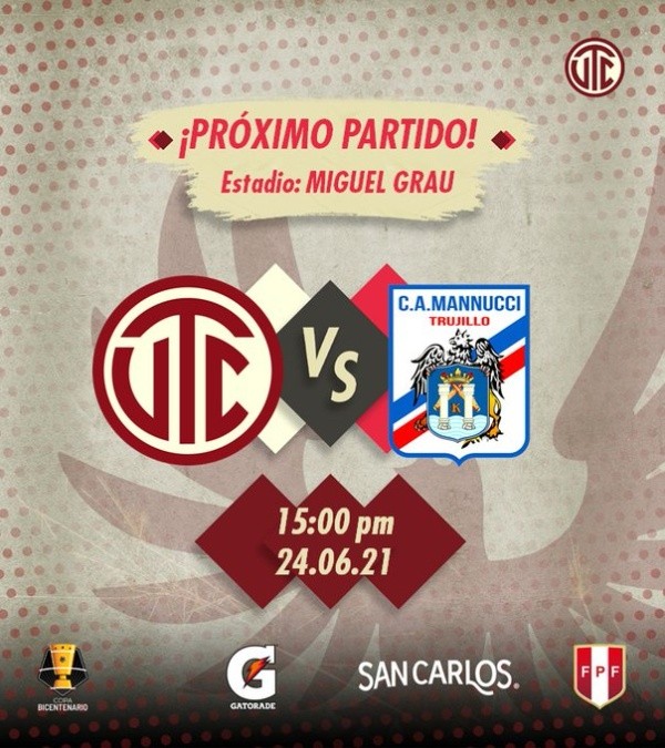 Los locales asumen este partido con la idea de seguir con vida en este torneo. UTC Cajamarca alcanzó esta instancia luego de superar al conjunto de Pirata con un 1 a 0 a su favor.