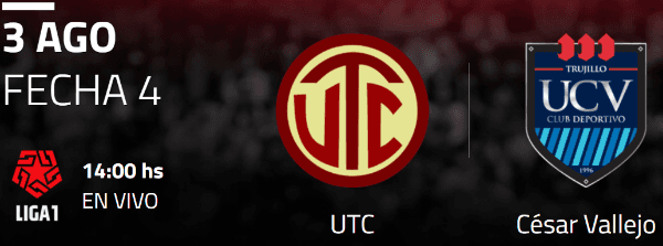 El partido de UTC vs. César Vallejo por la jornada 4 de la Liga 1 será este martes 3 de agosto desde las 13 horas locales en elEstadio Olímpico de San Marcos.