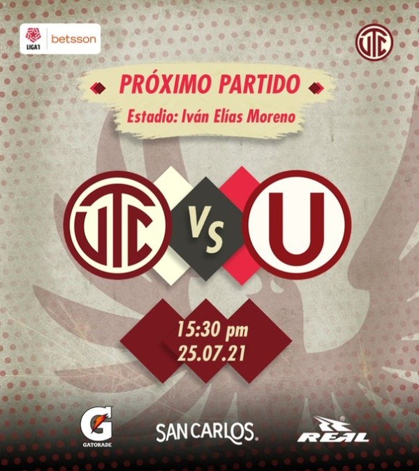 Continúan las emociones de laLiga 1 de Perú,y este domingo25de julioUTCen condición de local recibe al conjunto delUniversitarioen un partido que entregará grandes emociones a todos los fanáticos.El choque será televisadoEN VIVO Y EN DIRECTOa través de la pantalla deGOL PERU.