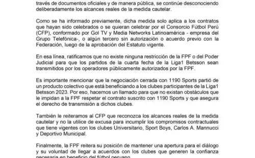 Según menciona el mensaje institucional, la FPF está al tanto de lo que han dicho los clubes. Dejando de lado lo que han publicado en sus redes sociales: “Dicha medida solo aplica a los contratos que hayan sido celebrados o se quieran celebrar por el Consorcio Fútbol Perú o algún tercero sin autorización o acuerdo previo con la Federación”.