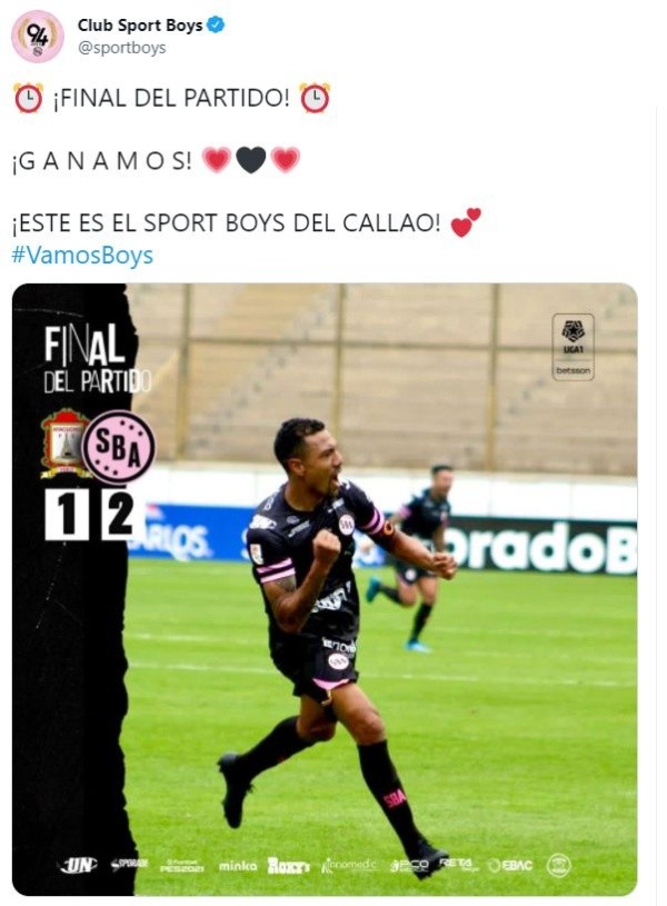 Esta sería la primera victoria del cuadro ‘chalaco’ quienes, en la primera fecha fueron derrotados a manos de Cienciano del Cusco, por 1-4, en esa oportunidad Joao Villamarín descontaría para el Sport Boys. El cuadro viene tomando su mejor ritmo futbolístico y eso se pudo ver hoy con la forma de juego que manejan los dirigidos por Gustavo Álvarez.