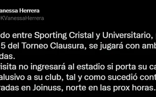 La comunicadora social precisó esto, si tienes pensado ir como espectador, apunta los siguientes detalles: “El partido entre Sporting Cristal y Universitario, por la fecha 15 del Torneo Clausura, se jugará con ambas hinchadas. La visita no ingresará al estadio si porta su camiseta o algo alusivo a su club, tal y como sucedió contra AL. Entradas en Joinnus, norte en las próximas horas”.