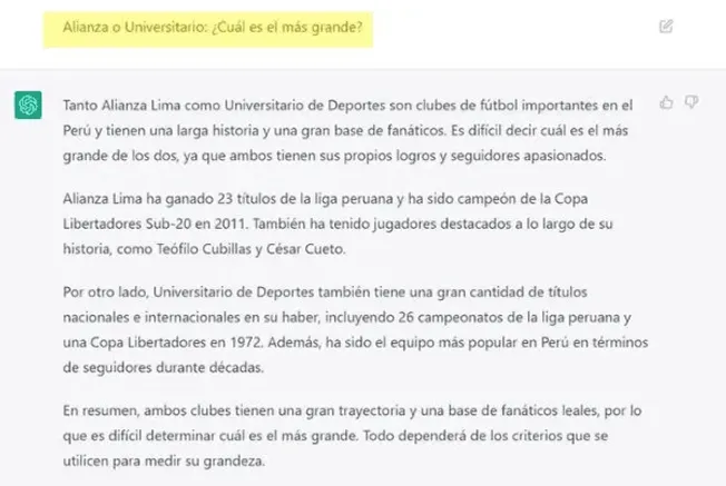 “Tanto Alianza Lima como Universitario de Deportes son clubes de fútbol importantes en el Perú y tienen una larga historia y una gran base de fanáticos. Es difícil decir cuál es el más grande de los dos, ya que ambos tienen sus propios logros y seguidores apasionados”, señaló el chat GPT.