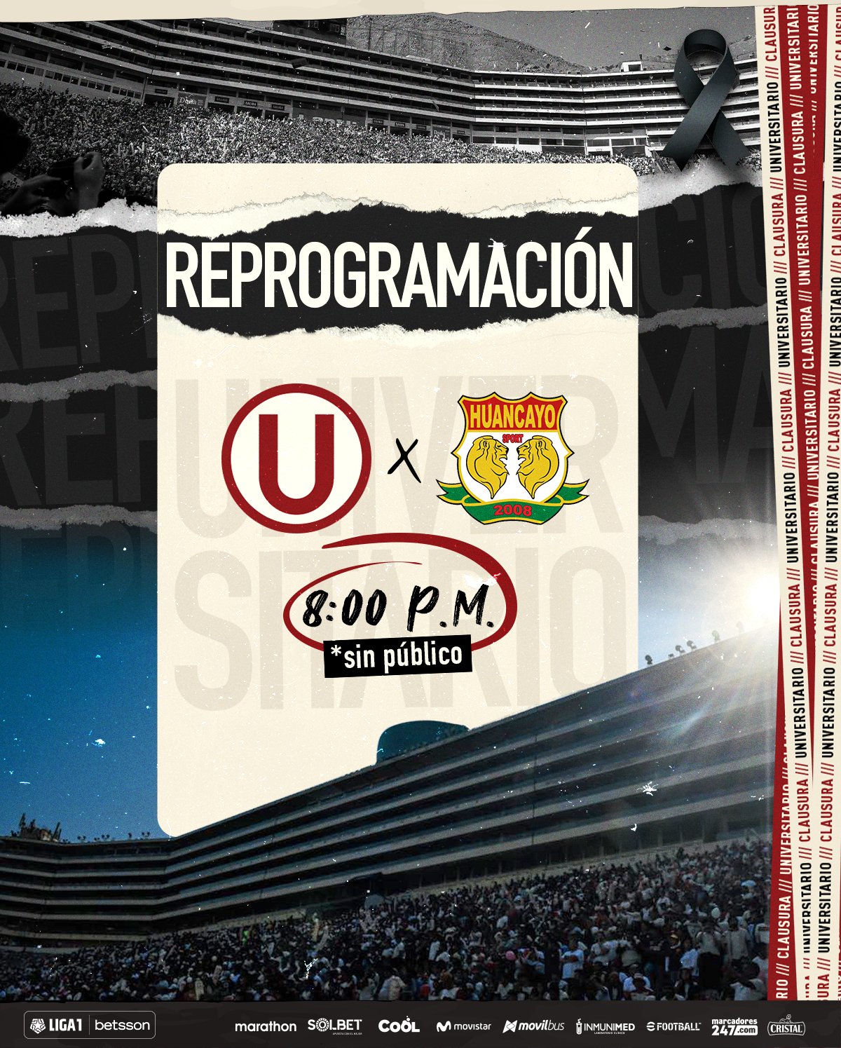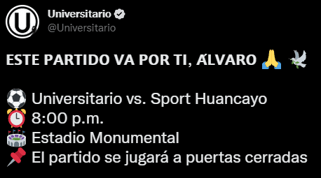 Universitario de Deportes informó que el partido a jugarse contra Sport Huancayo se estará disputando hoy desde las (8:00 PM – HORA PERUANA), pero a puertas cerradas por falta de garantías. El luto por el sensible fallecimiento de Álvaro Zevallos, se mantiene, y el fútbol peruano aplaude cada movilización al respecto. Aquí la información oficial al respecto.