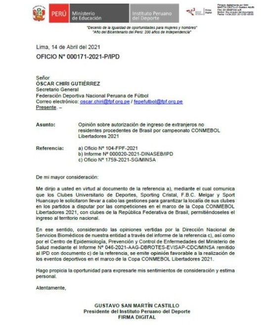 Lo que hasta hace unos días era preocupación, terminó con tranquilidad. Mediante un documento firmadoGustavo San Marín, presidente del Instituto Peruano del Deporte, se confirmó que los equipos peruanos Universitario, Sporting Cristal, Sport Huancayo y Melgar podrán ser locales ante equipos brasileños, luego que el gobierno diera la autorización.
