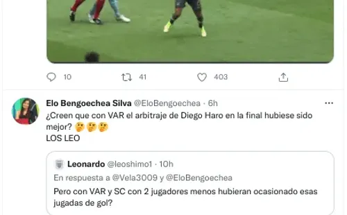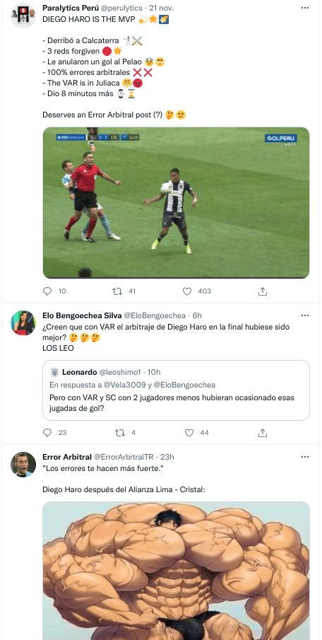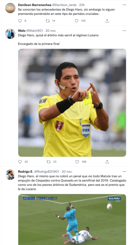 Por eso, desde las redes sociales, apuntaron hacía el juez. Hinchas de ambos lados criticaron al réferi e incluso lo vincularon con el presidente de la FPF, Agustín Lozano. Otros recordaron otros errores garrafales de Haro, incluso en el exterios. Acá algunos tweets.