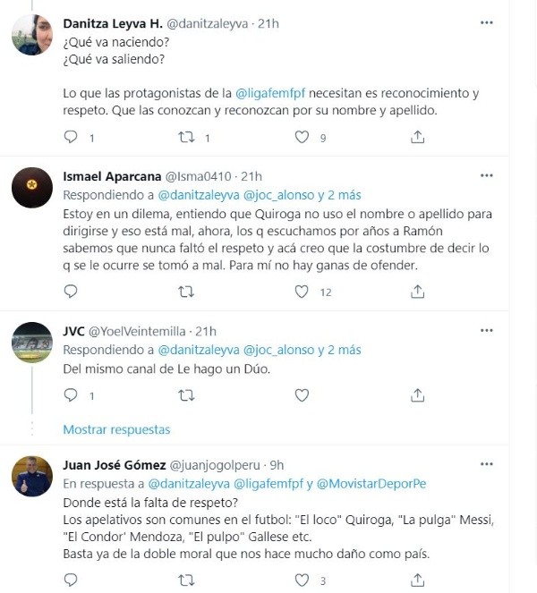 Este hecho hizo que una usuaria en Twitter realizara una publicación que decía: “Lo del Sr. Ramón Quiroga hoy en la transmisión de la @ligafemfpf es inaceptable. Respeto a las jugadoras, a los colores y a las instituciones. Solo eso: RESPETO Sr. Quiroga”, agregó en la famosa red social la usuaria: @danitzaleyva.