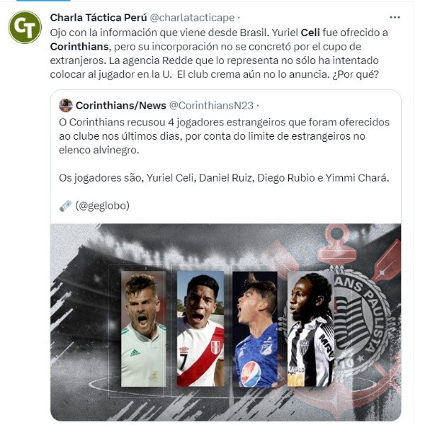 La información fue revelada por el portal brasileño GloboEsporte. el medio de ese país reveló que el mediocampista peruano Yuriel Celi fue ofrecido al Corinthians junto a otros tres deportistas: los colombianos Yimmy Chará y Daniel Ruíz y el chileno Diego Rubio.
