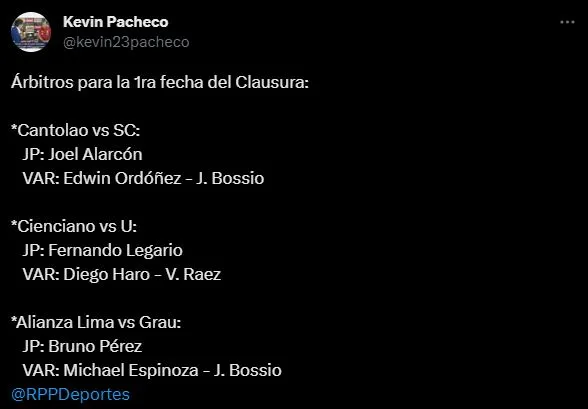 Kevin Pacheco, en su cuenta de Twitter, reveló el nombre de cada profesional de la justicia deportiva, los cuales tendrán participación en algunos cotejos de Liga 1. El Torneo Clausura tiene VAR, y los árbitros capacitados son los que explicará a continuación el comunicador social.