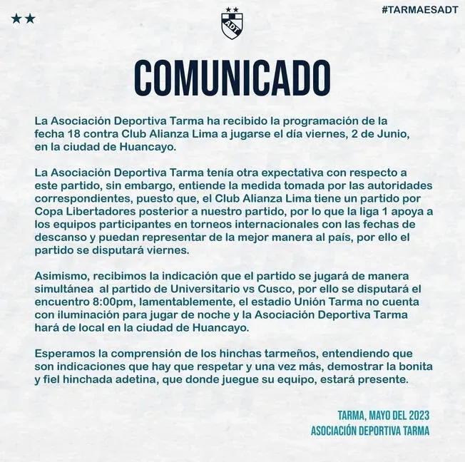 Explicando también, cómo se dará el tema de partidos paralelos, su cotejo como el de la “U” frente a Cusco FC: “Asimismo, recibimos la indicación que el partido se jugará de manera simultánea al partido de Universitario, por lo que se disputará a las 8:00 pm., lamentablemente, el estadio Unión Tarma no cuenta con iluminación para jugar de noche, por lo que ADT hará de local en Huancayo”.
