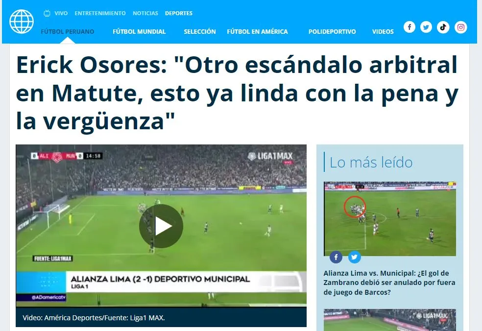 Aprovechó unos minutos dentro del noticiero que conduce en América Televisión, y dejó una crítica contundente contra los encargados de manejar la justicia en Liga 1: “Nuevo escándalo arbitral en Matute. Alianza Lima recibía a Municipal, otra vez el escenario extraordinario…”.